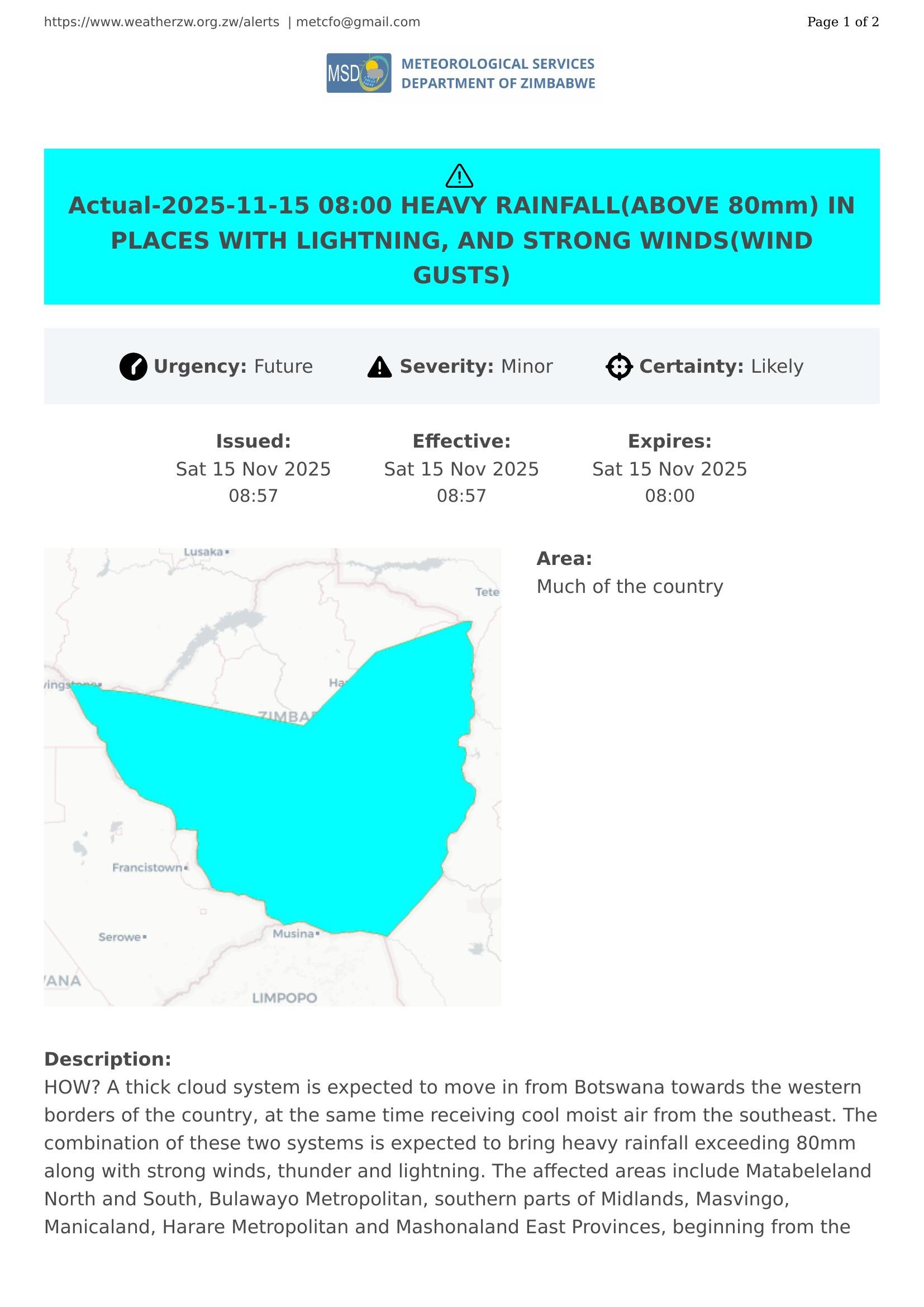 HOW? A thick cloud system is expected to move in from Botswana towards the western borders of the country, at the same time receiving cool moist air from the southeast. The combination of these two systems is expected to bring heavy rainfall exceeding 80mm along with strong winds, thunder and lightning. The affected areas include Matabeleland North and South, Bulawayo Metropolitan, southern parts of Midlands, Masvingo, Manicaland, Harare Metropolitan and Mashonaland East Provinces, beginning from the afternoon of Sunday, 16 through Tuesday 18 November 2025. These conditions may lead to flash floods in flood-prone zones and river basins, slippery roads with reduced visibility requiring longer braking distances, as well as fallen trees and powerlines. The public is therefore strongly advised to take precautionary measures as directed by the Civil Protection Unit.
