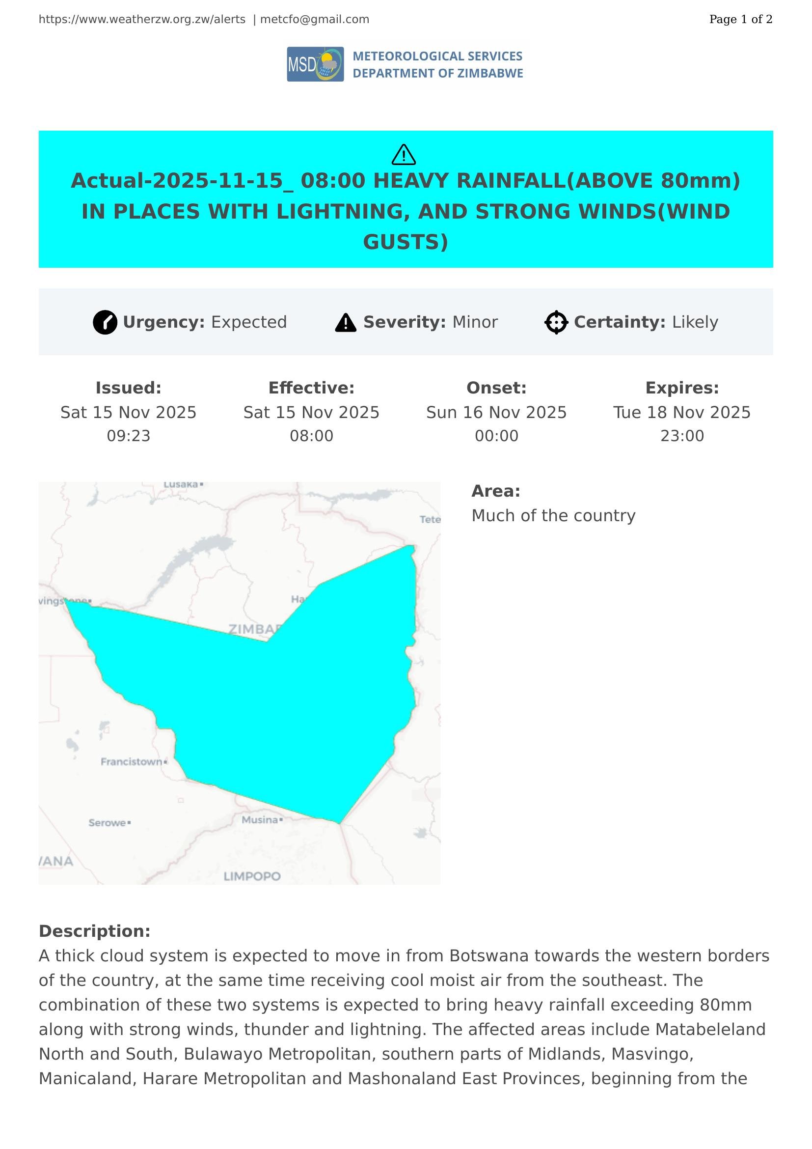 A thick cloud system is expected to move in from Botswana towards the western borders of the country, at the same time receiving cool moist air from the southeast. The combination of these two systems is expected to bring heavy rainfall exceeding 80mm along with strong winds, thunder and lightning. The affected areas include Matabeleland North and South, Bulawayo Metropolitan, southern parts of Midlands, Masvingo, Manicaland, Harare Metropolitan and Mashonaland East Provinces, beginning from the afternoon of Sunday, 16 through Tuesday 18 November 2025. These conditions may lead to flash floods in flood-prone zones and river basins, slippery roads with reduced visibility requiring longer braking distances, as well as fallen trees and powerlines. The public is therefore strongly advised to take precautionary measures as directed by the Civil Protection Unit.