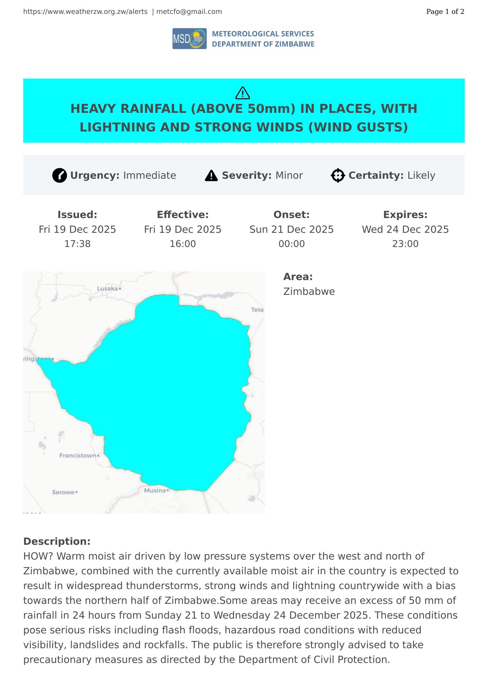 HOW? Warm moist air driven by low pressure systems over the west and north of Zimbabwe, combined with the currently available moist air in the country is expected to result in widespread thunderstorms, strong winds and lightning countrywide with a bias towards the northern half of Zimbabwe.Some areas may receive an excess of 50 mm of rainfall in 24 hours from Sunday 21 to Wednesday 24 December 2025. These conditions pose serious risks including flash floods, hazardous road conditions with reduced visibility, landslides and rockfalls. The public is therefore strongly advised to take precautionary measures as directed by the Department of Civil Protection.